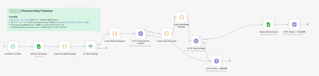 先说整体链路,其实很简单,定时触发 → Google Sheets 读取待发队列 → AI 生成 Pin 标题和描述 → 发送到 Make.com 发布 → 回写状态到表格 → 飞书通知。
