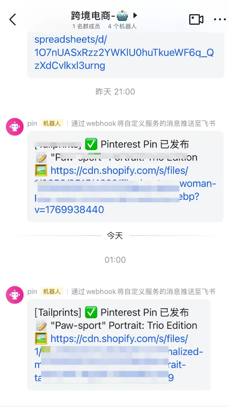 第二,飞书机器人会推一条消息过来,包含产品名称和图片链接。