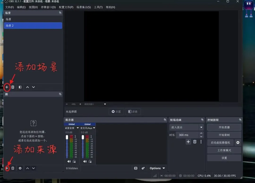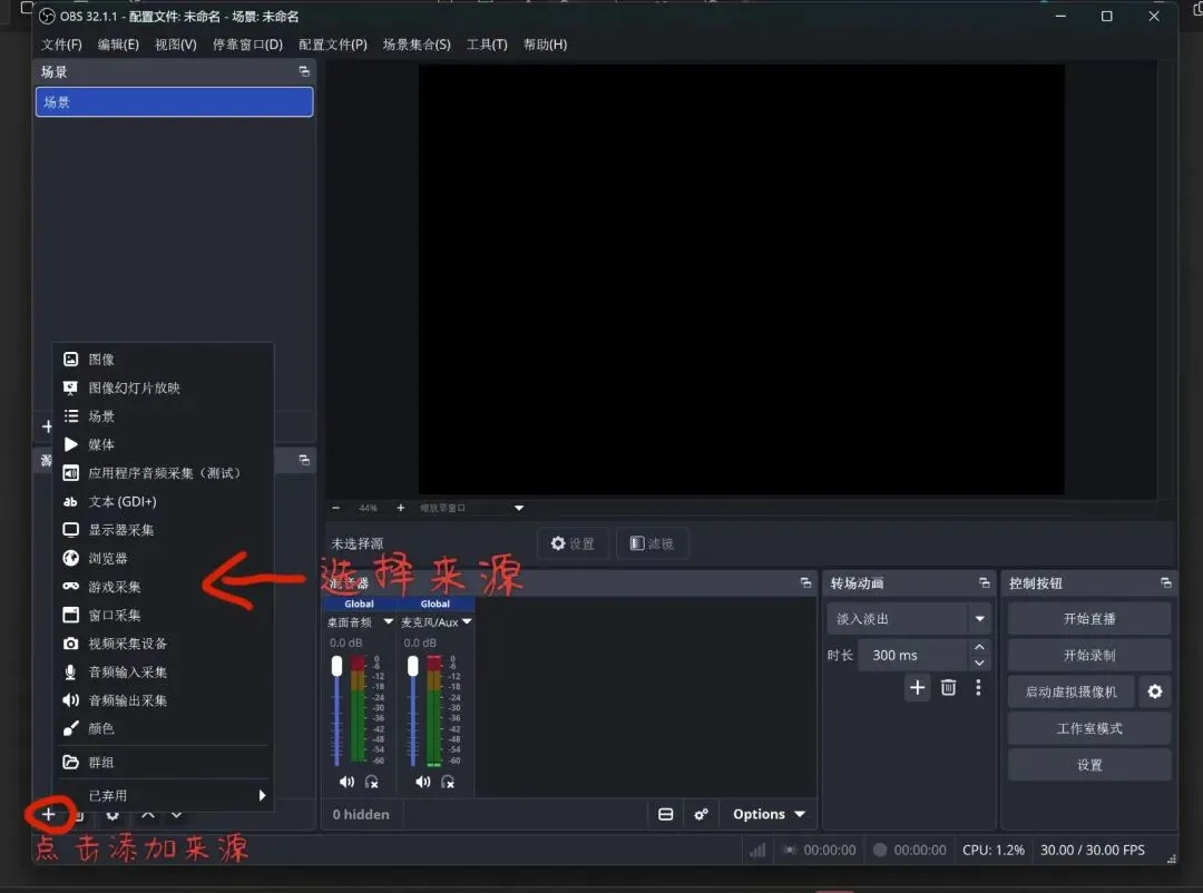 如果你第一次打开OBS软件不知道该点哪里