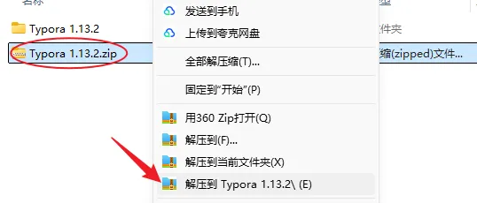 1.解压安装包:鼠标右击【Typora 1.13.2】压缩包,选择电脑上安装的解压软件,点击解压到【Typora 1.13.2】。