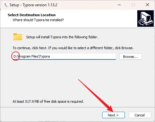 5.修改路径地址中的第一个字符C可更改安装位置(如:把C改为D软件将安装到D盘,安装路径不要出现中文),点击【Next】。