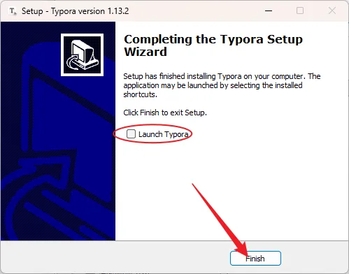 9.取消勾选【Launch Typora】,点击【Finish】。