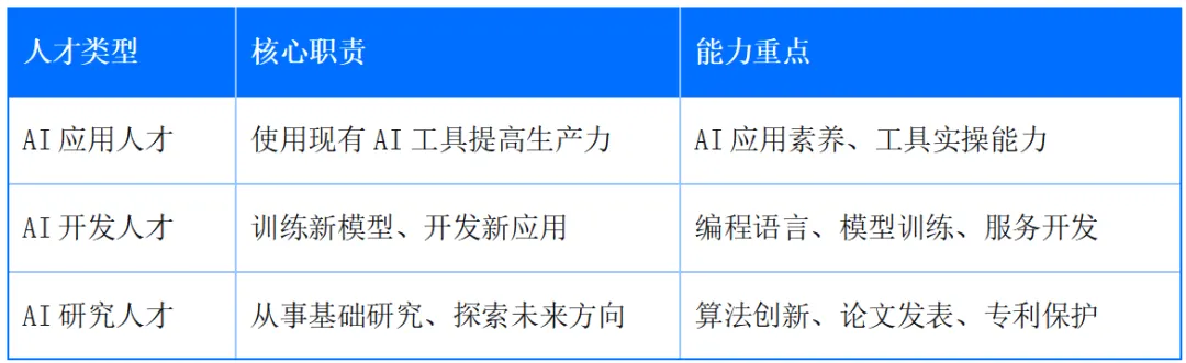将人才分为应用型、开发型、研究型三类,设计不同的培养路径。应用型人才重在工具使用,开发型人才重在技术落地,研究型人才重在源头创新。