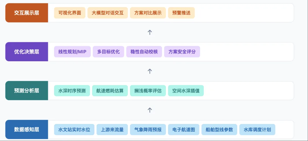 交互展示层解决的是"系统算出来了,但配载员看不懂"的问题。可视化界面展示航道水深分布、船舶吃水裕度、各方案的参数对比。更重要的是大模型驱动的自然语言交互界面——配载员可以直接用口头语言输入需求,比如"如果我今晚八点出发,最多能装多少,下游城陵矶那段最近水浅,帮我估一下",系统理解自然语言意图,调用后台数据和模型,用人话回答。