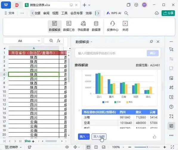 Step02:在打开的【数据解读】窗格中,推荐多个解读结果,选择其中一个结果,单击下方的【深入分析】按钮,如图2所示。