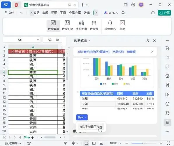 Step03:将智能深入分析数据,分析完成后单击【插入】下拉按钮;在弹出的下拉菜单中单击【插入到新工作表】命令,如图3所示。