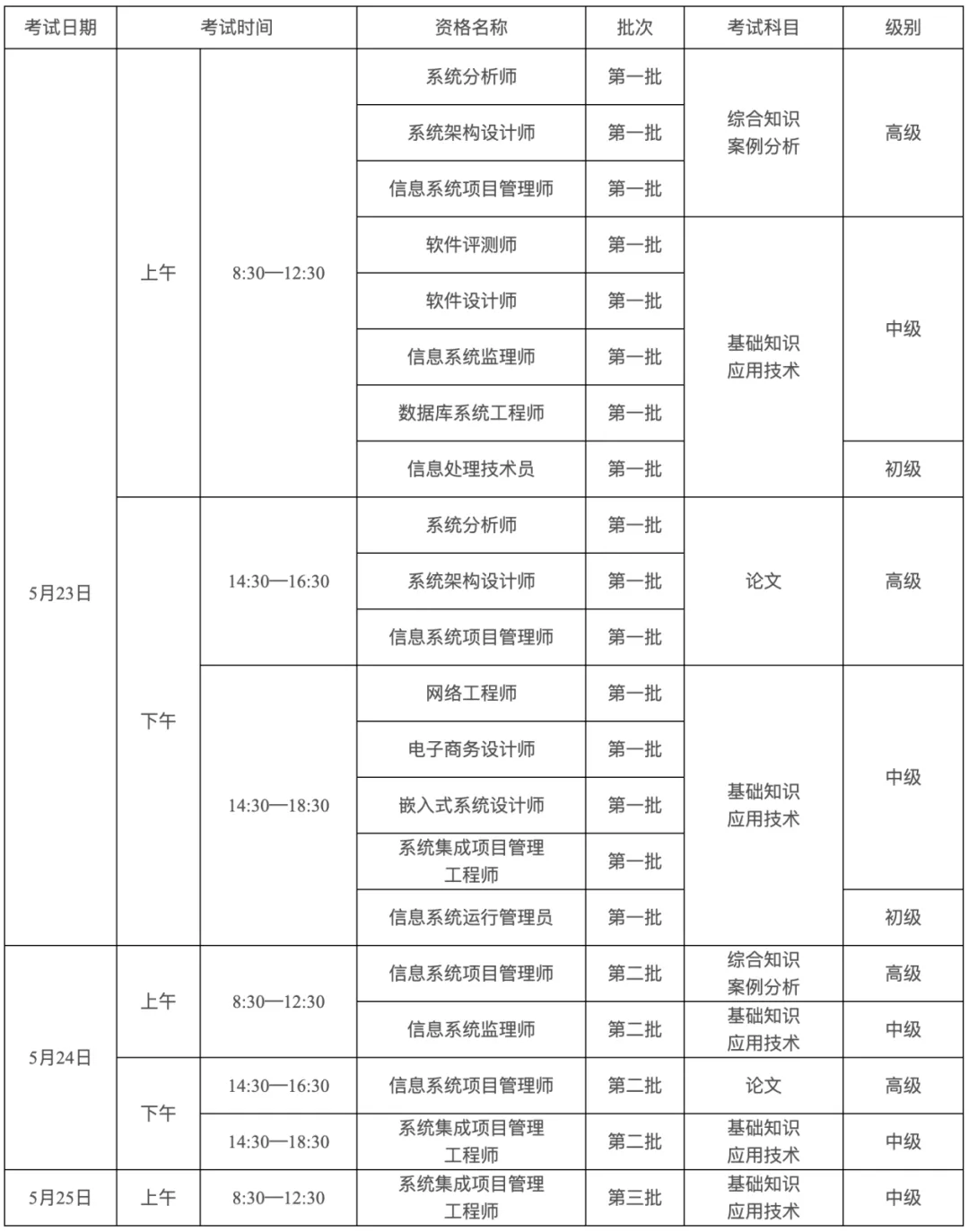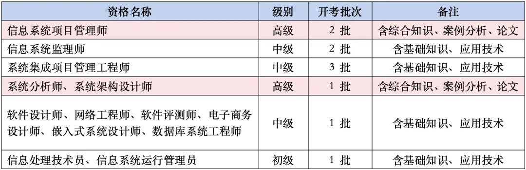 3、信息系统项目管理师、信息系统监理师、系统集成项目管理工程师因报考人数较多,以准考证标注的时间、批次为准,请按时参考。