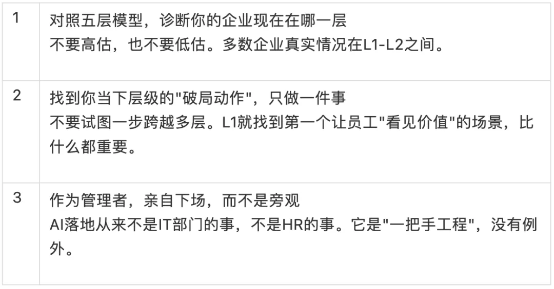 破局动作:用轻量级、高频、低门槛的场景切入——自动生成日报、一键整理会议纪要、智能排班。让员工在第一天就亲手做出一个能用的工具,看见效果,形成行为惯性。