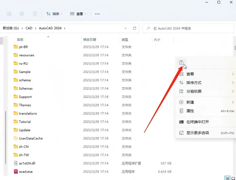 第七步:返回到“Crack”文件夹,打开“acad.exe”,右击选择复制。