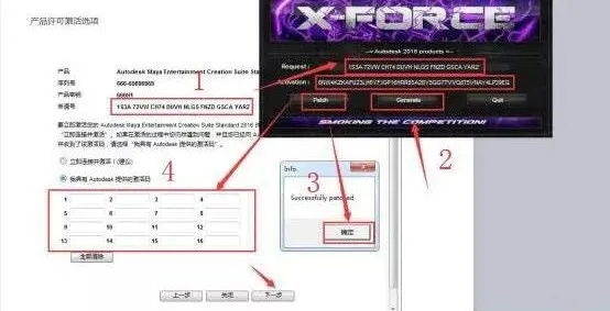 16.将“申请号”复制到注册机Request框内,点击“Generate”得到激活码,点击“Patch”确定,将得到的激活码复制到