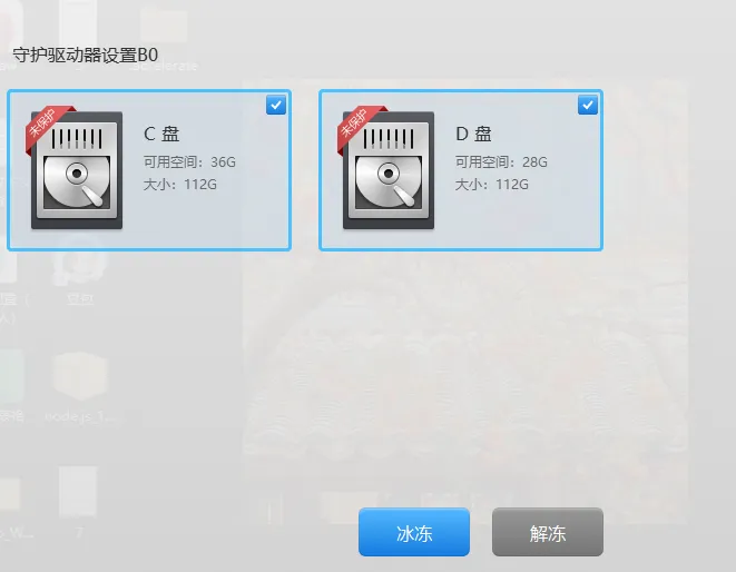 顾名思义呢,冰冻就是冻结硬盘的状态,可支持单独C盘,也可以支持C盘和D盘两个盘,或者是你有E盘F盘都可以的,可以支持冻结全部磁盘,点击冰冻以后,只要再重启就可以了。