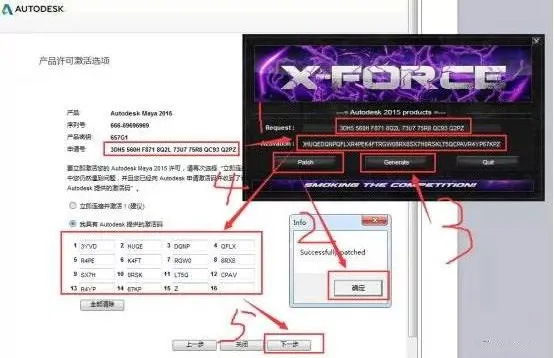 15.将“申请号”复制到注册机Request框内,点击“Patch”确定,点击“Generate”得到激活码,将得到的激活码复制到