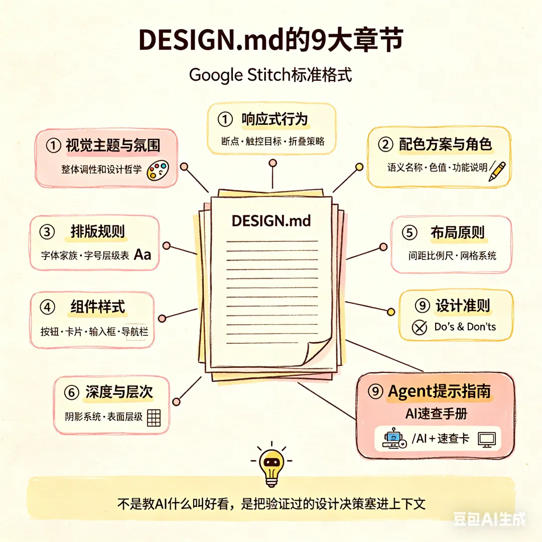 这个概念最早由 Google Stitch 提出。AI 读 Markdown 最顺畅,那就把设计规范也写成 Markdown:颜色用什么色值、字体用什么字号、按钮长什么样、间距怎么定,全部结构化地写清楚。
