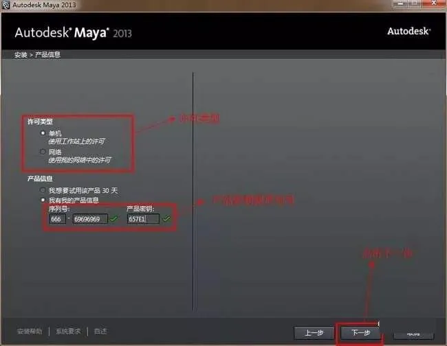 5.输入序列号:666-69696969 密钥:657E1 点击下一步。