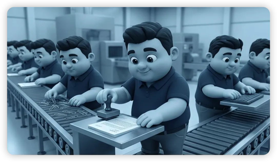 一个白领花了一周时间,把 PPT 模板从十个增加到五十个。他觉得自己在"提升效率"。但在老板眼里,他做的事情跟工厂里把每分钟产量从一百提到一百二的工人没有本质区别——都是优化流程。
