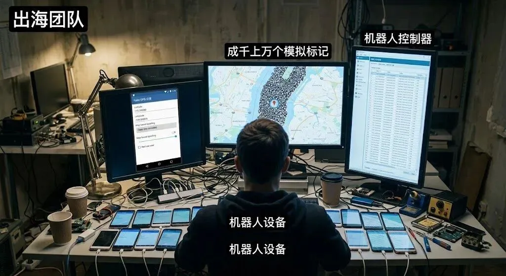 然而,做陌生人社交面临着一个永恒的痛点:冷启动期的“空城效应”。如果一个真实用户下载 App 后,发现附近连一个可以聊天的人都没有,他会瞬间流失。为了制造繁荣的社区假象,大量出海团队采用了“虚拟定位(Fake GPS / Location Spoofing)”和“机器人群控”技术,把成千上万个虚拟账号的坐标强行修改到真实用户周围。