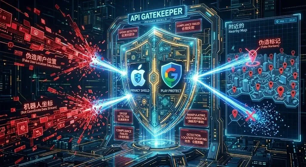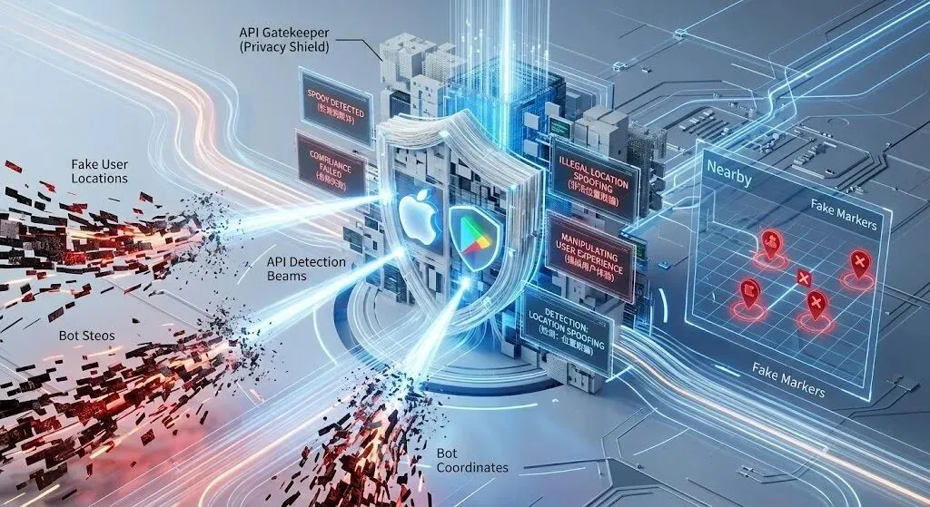 在过去,这种“注水”手段或许能蒙混过关。但到了 2026 年,Apple App Store 和 Google Play 的底层操作系统 API 已经完成了对“定位欺骗”的围剿。一旦您的社交 App 被抓包使用虚拟坐标来欺骗用户,将被直接定性为“操纵用户体验(Manipulating User Experience)”与“欺诈(Fraud)”,面临全网下架及账号连坐的雷霆打击。本文将为您深度排雷,探讨 LBS 社交产品如何合规突围。