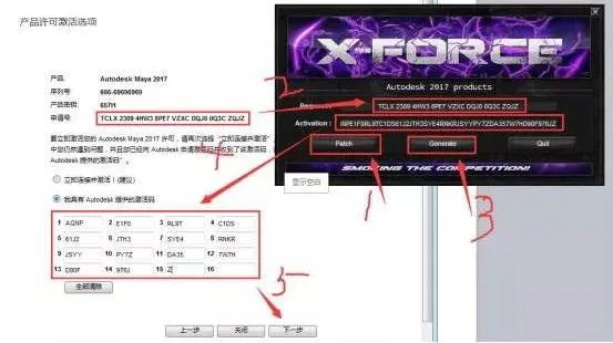 19.点击“Patch”确定,将“申请号”复制到注册机Request框内,点击“Generate”得到激活码,将得到的激活码复制到
