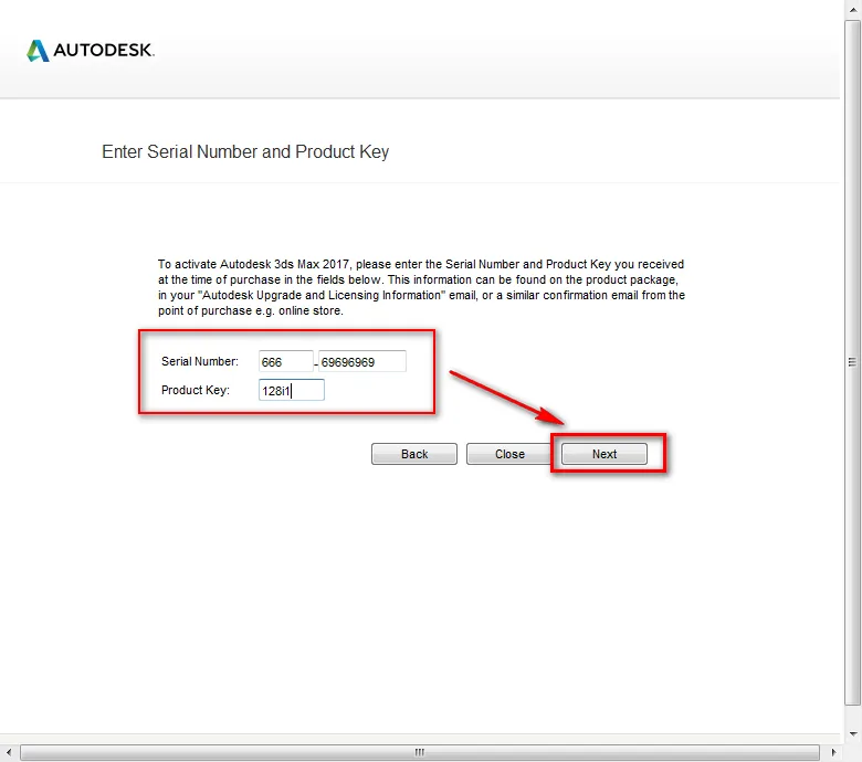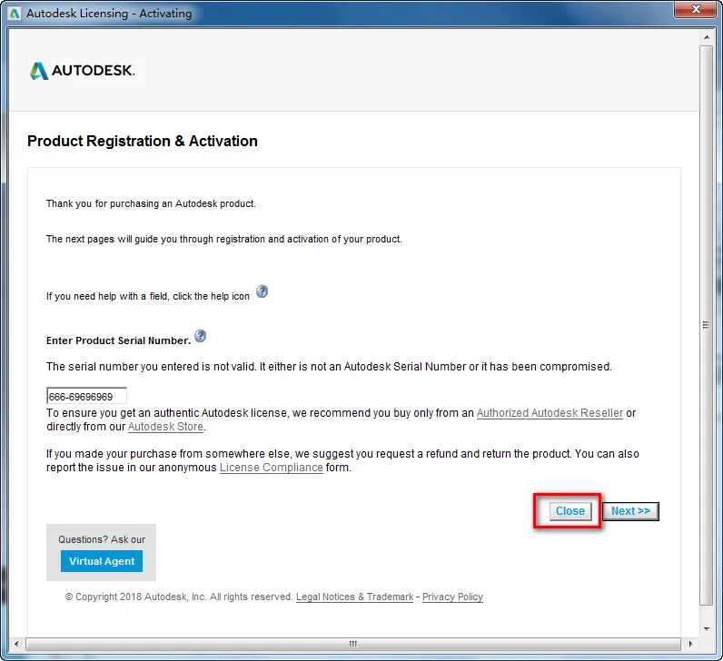 11.点击“I Agree” ![]() 12.点击“Activate” 13.输入序列号:666-69696969,安装代码:128i1,点击“Next” 14.如果出现以下提示,点击“Close”,重复步骤12~13 15.选择“I hava an activation code from Autodesk”