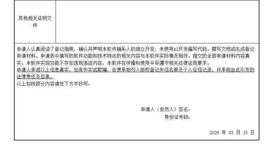 “未使用AI开发编写代码、撰写文档或生成登记申请材料”
