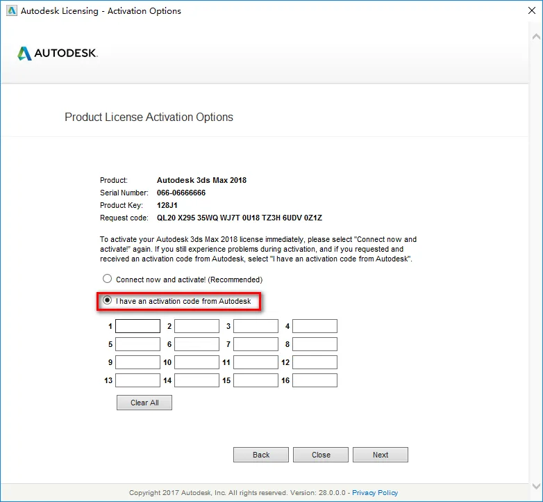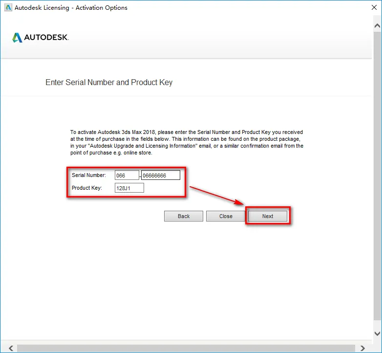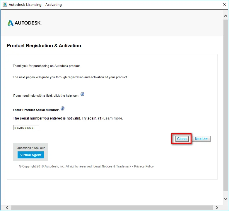 11.点击“Activate” ![]() 12.输入序列号“066-06666666”,产品密钥“128J1”,点击“Next” 13.如果出现以下提示,点击“Close”,重复步骤11~12 14.选择“I hava an activation code from Autodesk”
