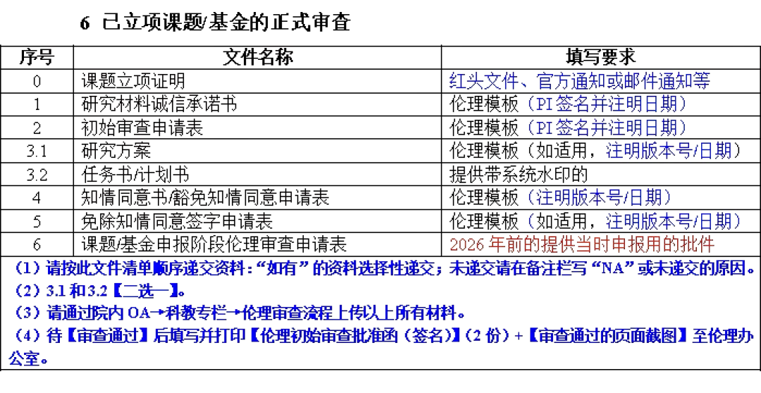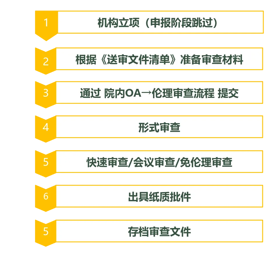 3. 第三步(正式审查):立项材料审核通过后,该项目需向伦理委员会提交材料进行正式审查。只有在获得伦理委员会正式批件后,方可启动研究工作。