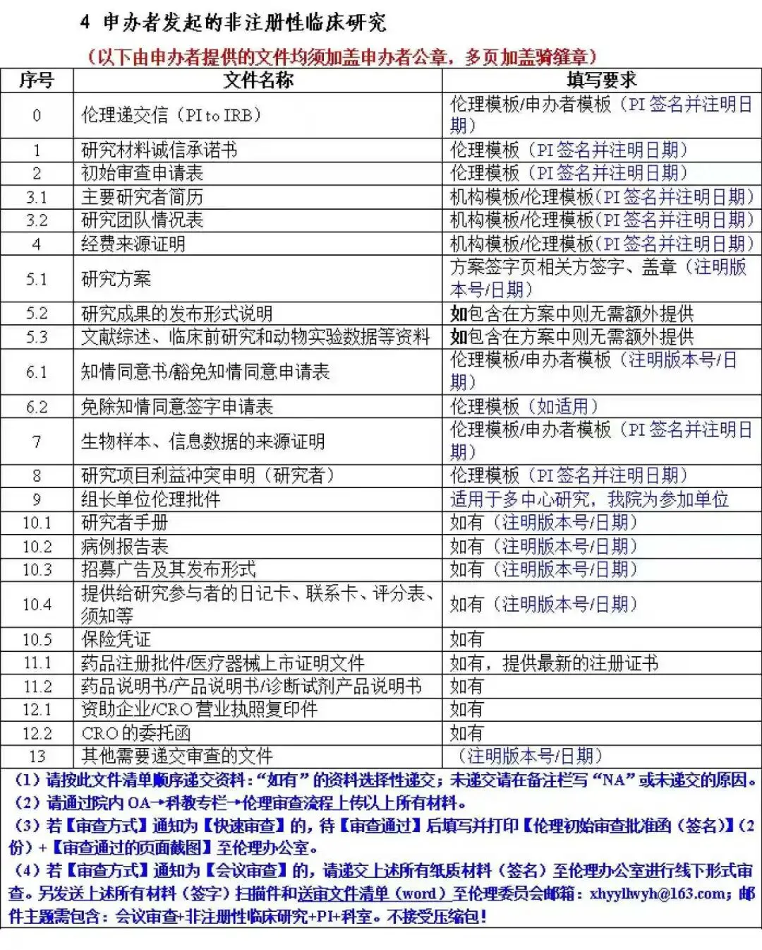 非注册性研究项目递交材料需准备递交信,递交信应包含:项目名称、方案编号(如有)、本中心伦理编号、研究产品、申办者、主要研究者、送审文件清单等内容。