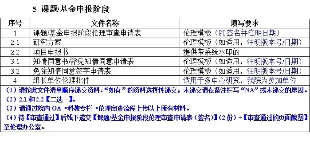 1. 第一步(预审阶段):项目负责人需依据《送审文件清单》要求,提交《课题/基金申报阶段伦理审查申请表》及相关支撑材料,申请伦理预审。