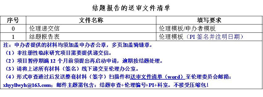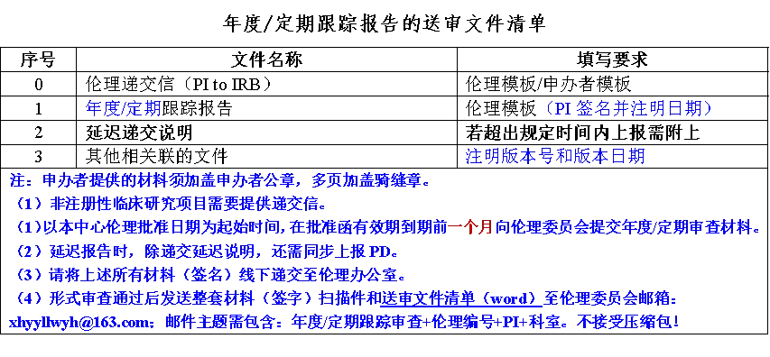 2)定期跟踪报告:审查频率少于12个月的项目,应按伦理委员会要求的频率提交定期跟踪报告,同样应在报告到期前1个月提交。