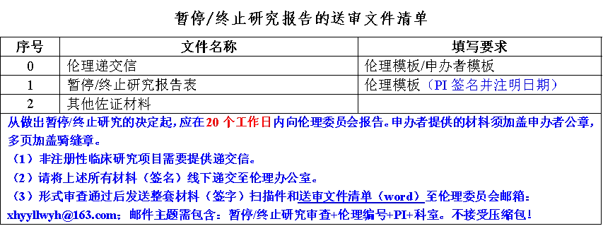 研究者/申办者提前终止或暂停临床研究,应及时提交暂停/终止研究报告,最迟不超过20个工作日。