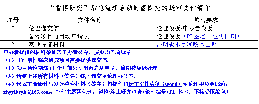 若为暂停研究后需重新启动的项目,应当提交《暂停项目再启动申请表》,经伦理委员会审查批准后方可重新开展。