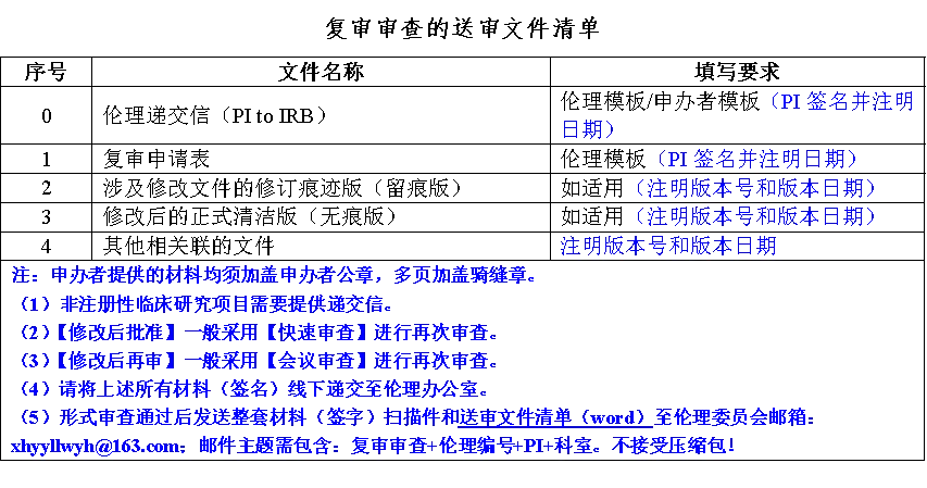 (1)按伦理审查意见“修改后批准”或“修改后再审”的要求完成修改后,应当提交复审申请,经伦理委员会审查同意后方可实施。