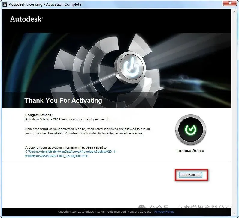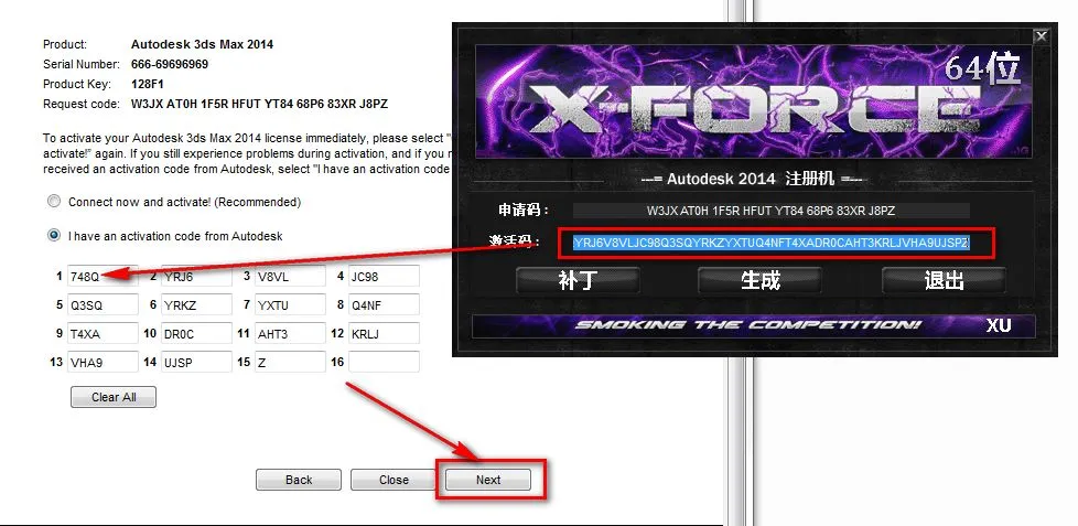 16.选中Autodesk 2014 Keygen_64位,鼠标右键选择“以管理员身份运行” ![]() 温馨提示:若打开没有注册机,说明被电脑杀毒软件隔离了,关闭杀毒软件重新解压即可。 17.将申请号复制到Request输入框中 注:复制和粘贴只能用快捷键"Ctrl+C"和”Ctrl+V” ![]() 18.点击“补丁”,再点击“生成” ![]() 19.将生成的激活码复制到激活码输入框,点击“Next” 注:复制和粘贴只能用快捷键"Ctrl+C"和”Ctrl+V” ![]() 20.激活成功,点击“Finish” ![]() 21.在开始菜单中找到并打开“3ds Max 2014 - Simplified Chinese”