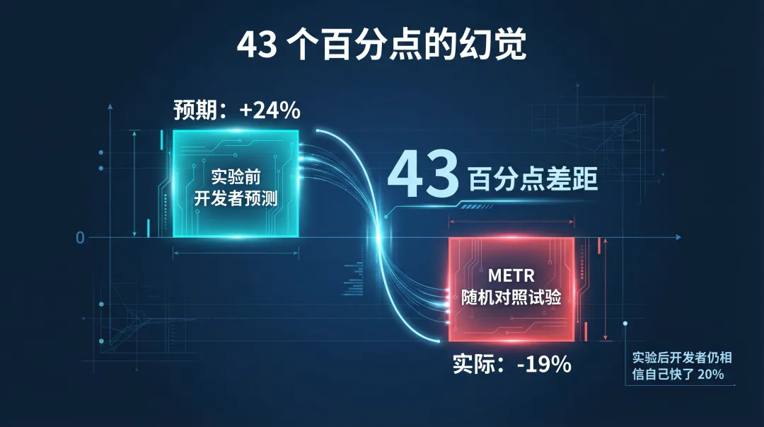 开发者对 AI 效果的主观感受和客观测量之间,存在 43 个百分点的差距。 即使亲身经历了"变慢",他们依然相信自己"变快了"。