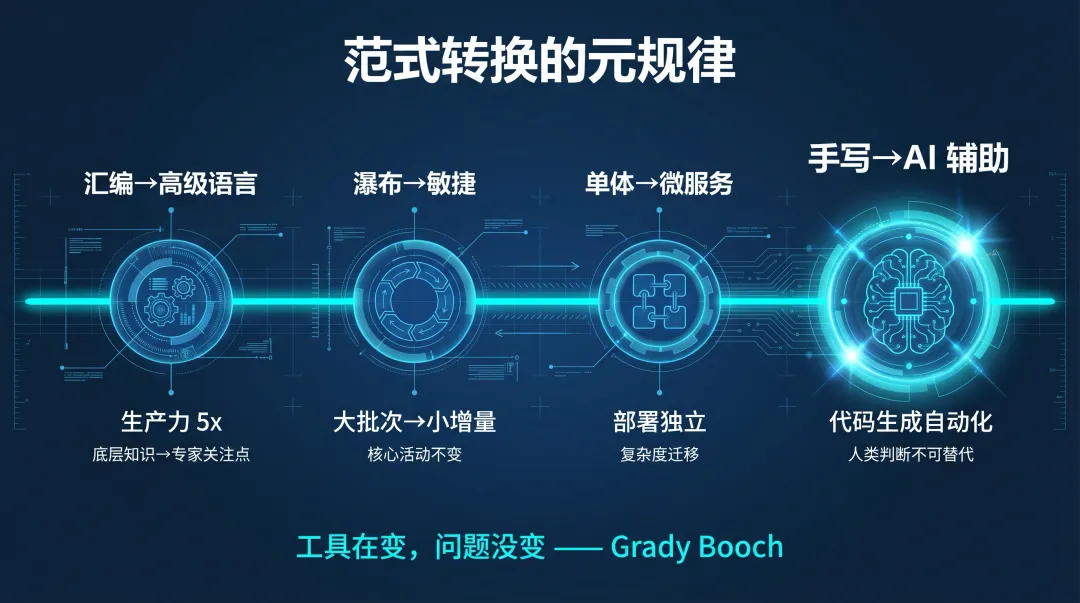 | 手写 → AI 辅助 | 代码生成自动化 | 对本质复杂度的人类判断 |