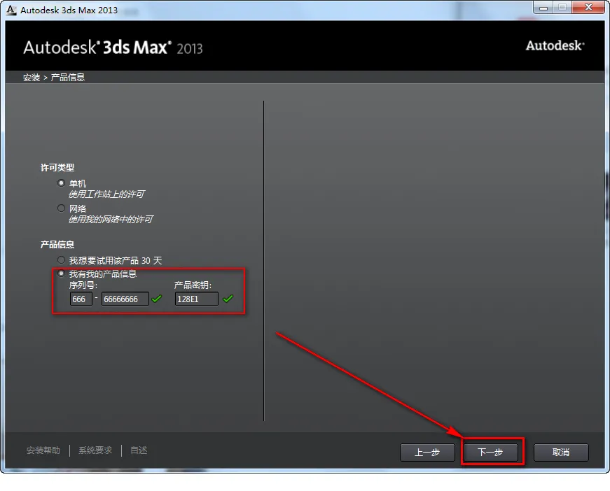 6.序列号:666-66666666,产品密钥:128E1,点击“下一步”