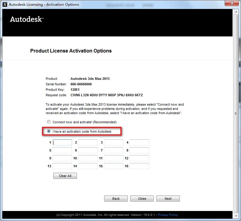 14.选择“I have an activation code from Autodesk”