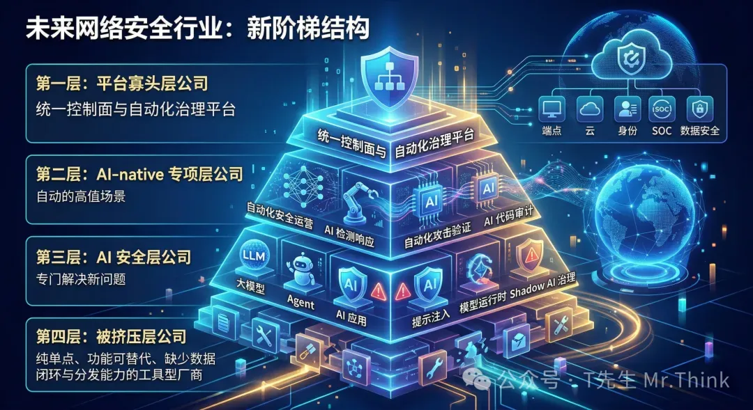 未来 2 到 5 年,网络安全市场大概率会出现明显分层:有些公司会变得更强,有些公司会被边缘化,也会有一批新型安全公司迅速崛起,形成新的产业阶梯。