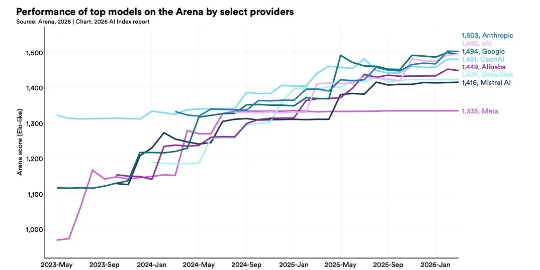 2025年,美国产出了50个代表性模型,中国产出了30个。根据各个模型在Arena排行榜上的得分,截至2026年3月,Anthropic的顶级模型在Arena排行榜上以Elo分1503领先,差距约为2.7%,且在过去一年中一直在持平到个位数范围内波动。