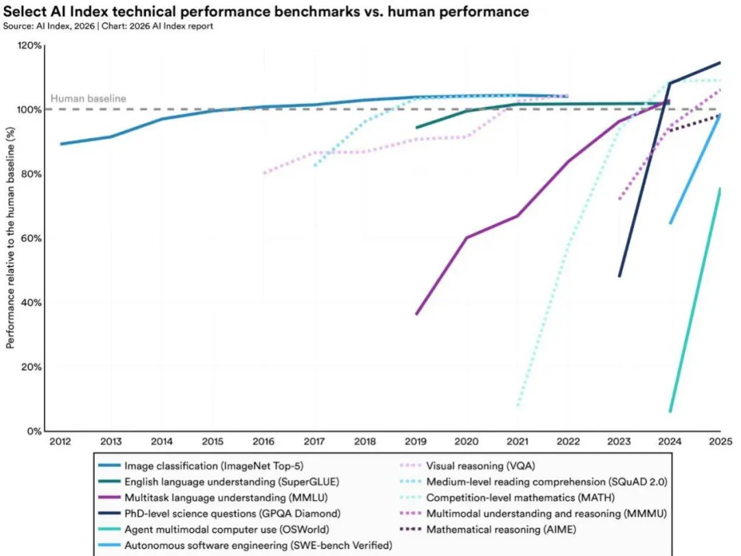 在这份报告中,AI的发展继续一路高歌猛进,大量原本预期可以维持数年的高难度基准测试,如今往往在几个月内便告破防。然而,在一些普通人类可以轻松完成的"简单"任务中,AI却依然屡屡碰壁。