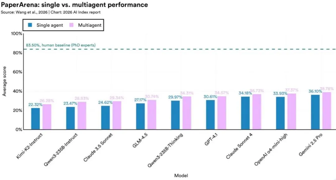 在端到端科研任务评测PaperArena上,最好的AI 智能体得分38.8%,博士专家的基准是83.5%,不到一半。在真实生物信息学分析任务BixBench上,前沿模型的准确率约为17%。在地球观测问题评测UnivEarth上,AI agent的回答准确率为33%,生成的代码有58%运行失败。
