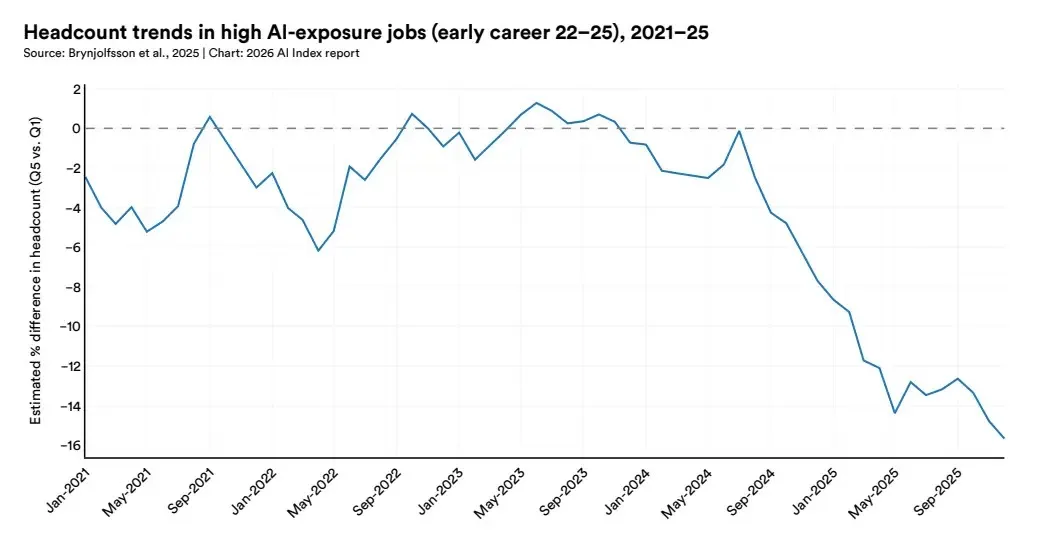 从数据上看,美国22–25岁的年轻群体中,高AI暴露职业的就业水平相比低暴露职业下降了约16%。这一差距差距自2024年年中开始扩大,并在此后持续增长。