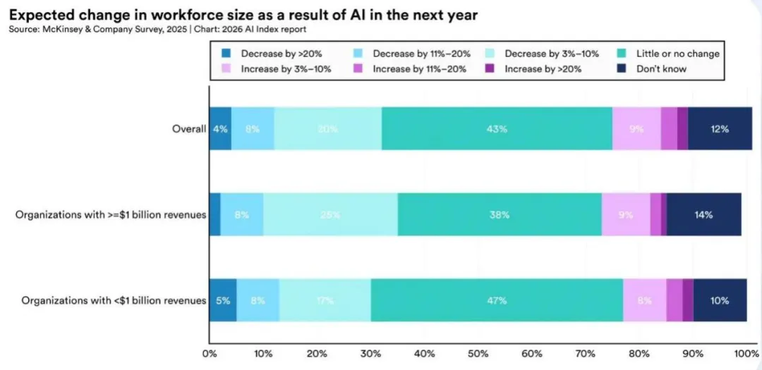 虽然从整体来说,AI还没有明确导致失业,但是从雇主的态度上,可能很多职位在未来都会受到削减。据麦肯锡2025年的调查,约三分之一的受访者预计员工规模将出现下降,而且这一比例在大型企业(年收入≥10亿美元的企业)中更高,而只有很少的雇主计划增加人手。