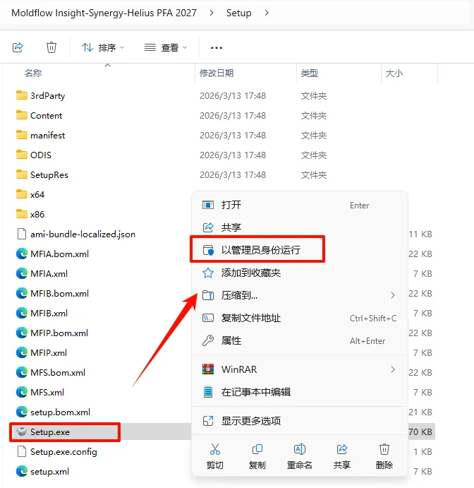 2.打开刚刚解压的文件夹,双击打开“Setup”文件夹,选中“Setup.exe”文件,鼠标右键选择“以管理员身份运行”