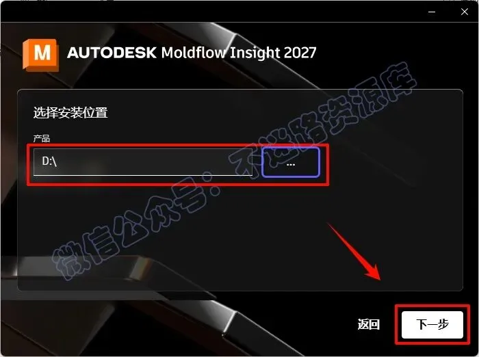 4.点击“...”可以选择软件安装路径,建议和教程中的保持一致,本例安装在D盘(如:将C改为D表示安装到D盘,安装路径不要出现中文),点击“下一步”