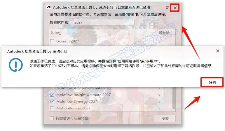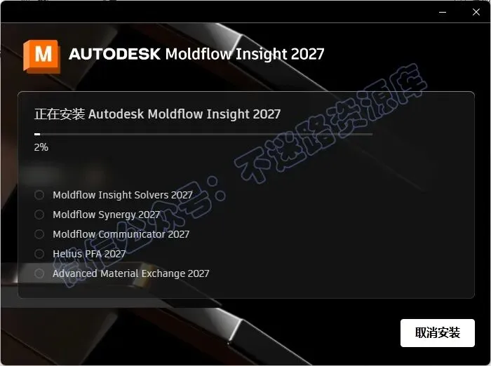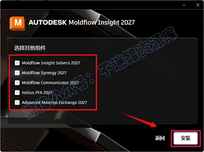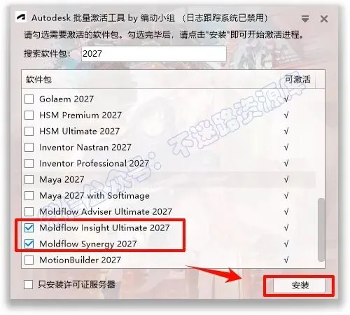 9.根据安装的软件勾选相应的项,教程这里勾选“Moldflow Insight Ultimate 2027”和"Moldflow Synergy 2027",点击“安装”