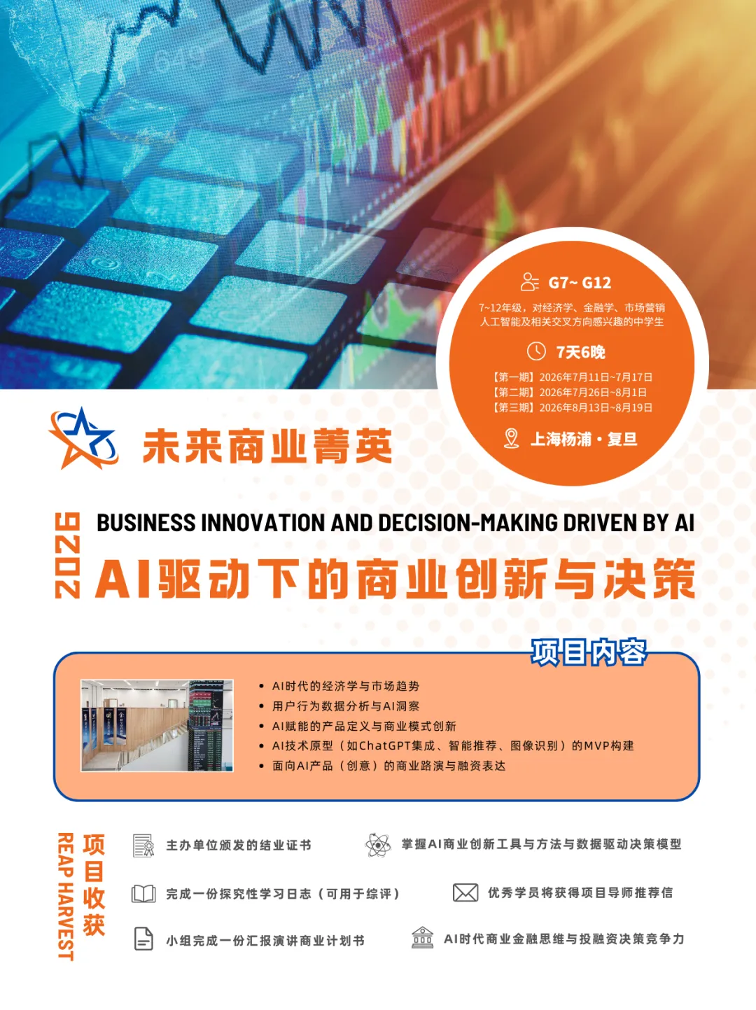 AI正在重塑每一个行业,未来的商业菁英必须是懂技术的管理者。如果您的孩子对经济、商业、科技创新充满兴趣,这个在复旦大学举办的夏令营,将赋予他们驾驭智能经济浪潮的核心能力!