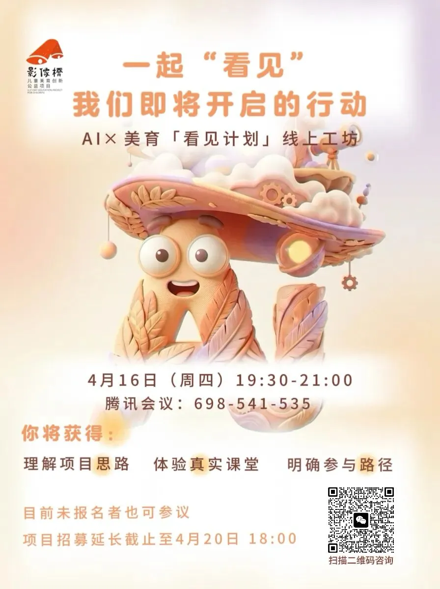 感谢大家近期对 AI×美育「看见计划」 的关注与参与,也对已经在4月10日前申请参与项目的伙伴表示欢迎,根据大家的反馈,项目组特计划举办一场线上工作坊带领大家: