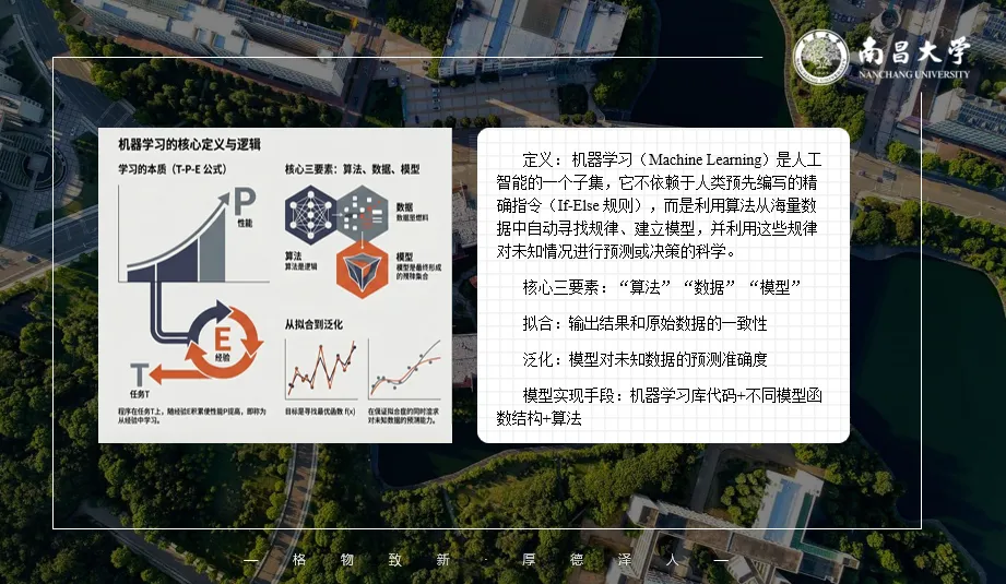 机器学习(Machine Learning)是人工智能的一个子集,它是利用算法从海量数据中自动寻找规律、建立模型,并利用这些规律对未知情况进行预测或决策的科学。徐承翰同学从编程与机器学习关系、机器学习的模型参数与“调参优化”、模型拟合效果与评价指标这三个部分带领同学们打开机器学习的大门。