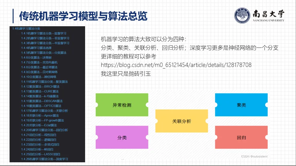 这一部分,徐承翰同学介绍了涵盖无监督学习(如K-means聚类、层次凝聚聚类、DBSCAN、LDA主题提取、PCA主成分分析)和有监督学习(如决策树、随机森林、XGBoost、K近邻算法、神经网络、CNN、RNN及Transformer架构)的常见模型。这一部分不仅详细讲解了各类模型的原理、适用场景和调参方法,还强调了模型拟合效果与泛化能力的评估标准,如训练集与测试集准确率差异、R方、损失函数曲线等,帮助我们能在实际应用中科学选择与使用模型。